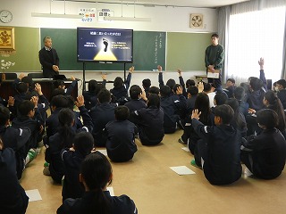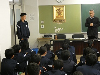 2年生の総合学習の時間に、下平先生から講話を行ってもらいました。「1年後の自分」はどうなっていたいか、そうなるために大切にすることは何かを、これまでの卒業生の例を交えながらお話をしてもらいました。最後に講話を聞いて「自分は、これから何をしていくか」を宣言するという時間でした。多くの生徒が、中学校最後の1年間の過ごし方に、目標をもつことができた有意義な時間となりました。