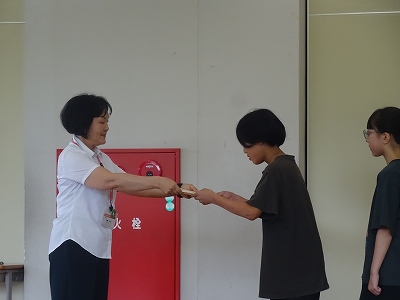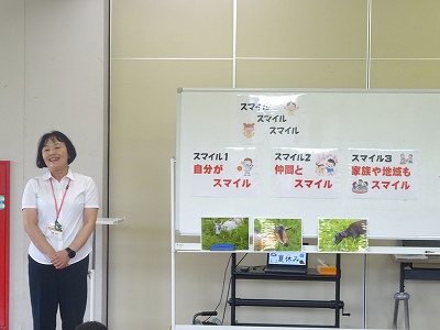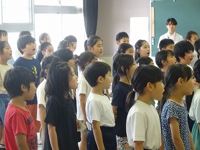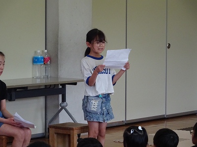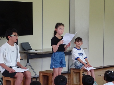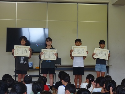 7月18日(金)1学期終業式を行いました。明るく元気な校歌で始まり、3人の子が1学期のまとめを堂々と話しました。連絡では、水の事故防止について5年生が着衣泳の体験学習で学んだことを、自分事として全校に広めました。また、健康優良児や歯の優良児の表彰を行いました。