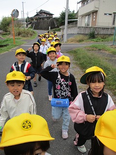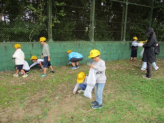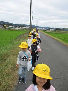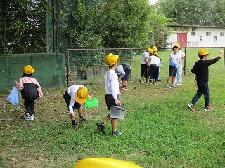 さわやかな秋空の元、共和中学校まで歩いて行き、どんぐり拾いをしました。どんぐりだけでなく、秋の虫たちにも興味津々。拾ったどんぐりは、どんぐりごまなどのおもちゃ作りに使う予定です