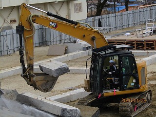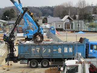 3学期から仮設校舎を解体しています。日に日に解体され、最後はエレベーターだけが残りました。様々な重機が、解体を行い、子どもたちも興味津々に見ていました。
