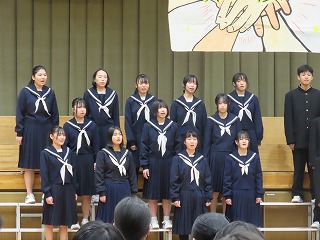 合唱発表会当日、学級閉鎖で合唱を披露することができなかった2年1組の学級合唱を、学校開放日に体育館で披露しました。また、2年生全学級での学年合唱も披露しました。2年生の保護者の皆様にも参観していただき、2年1組にとって大変すばらしい会となりました。