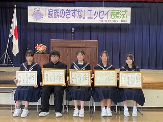 応募数小中学校合わせて504点の作品の中から、20点が優秀賞又は入選に選ばれた中で、本校の生徒7名が表彰をされました。優秀賞の皆さんのエッセイ発表もありました。どの作品も父母、祖父母、兄弟姉妹等への愛情や感謝の気持ちが伝わる素敵な作品ばかりでした。