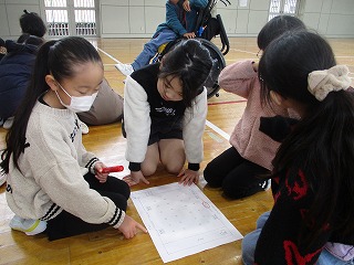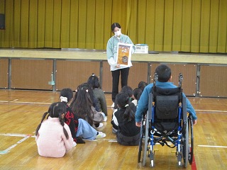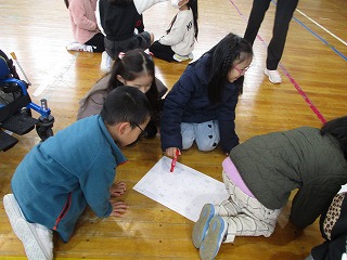 2年生が防災学活で「もし体育館で地震が発生したら」ということについての授業を行いました。仲間とともに練り合いながらいざという時にどうするとよいかということについて考えることができました。