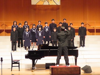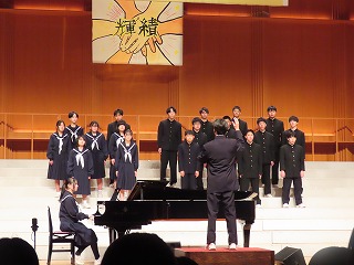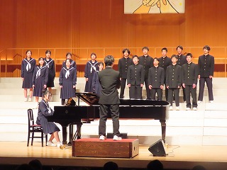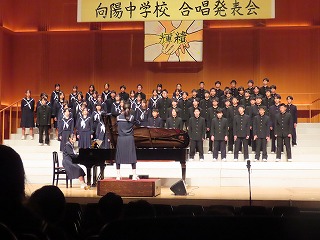 可児市文化創造センター(アーラ)の素晴らしい会場、舞台で合唱を通して伝えたい思いを込め、これまでの練習の成果を精一杯発揮して合唱を披露しました。残念ながら2年1組は学級閉鎖のため発表することができませんでした。また、発表した学級の中でも多くの生徒がインフルエンザで参加することができませんでした。しかし、一緒にこの舞台で歌いたかった仲間の思いも込めた大変すばらしい合唱を披露してくれました。向陽中学校の伝統である合唱を見事に引き継ぐ姿としてふさわしい会となりました。